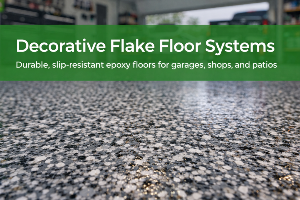 Transform your garage into a clean, bright, and durable space. Our epoxy + flake system resists hot tire pickup, chemicals, road salt, and heavy use.
