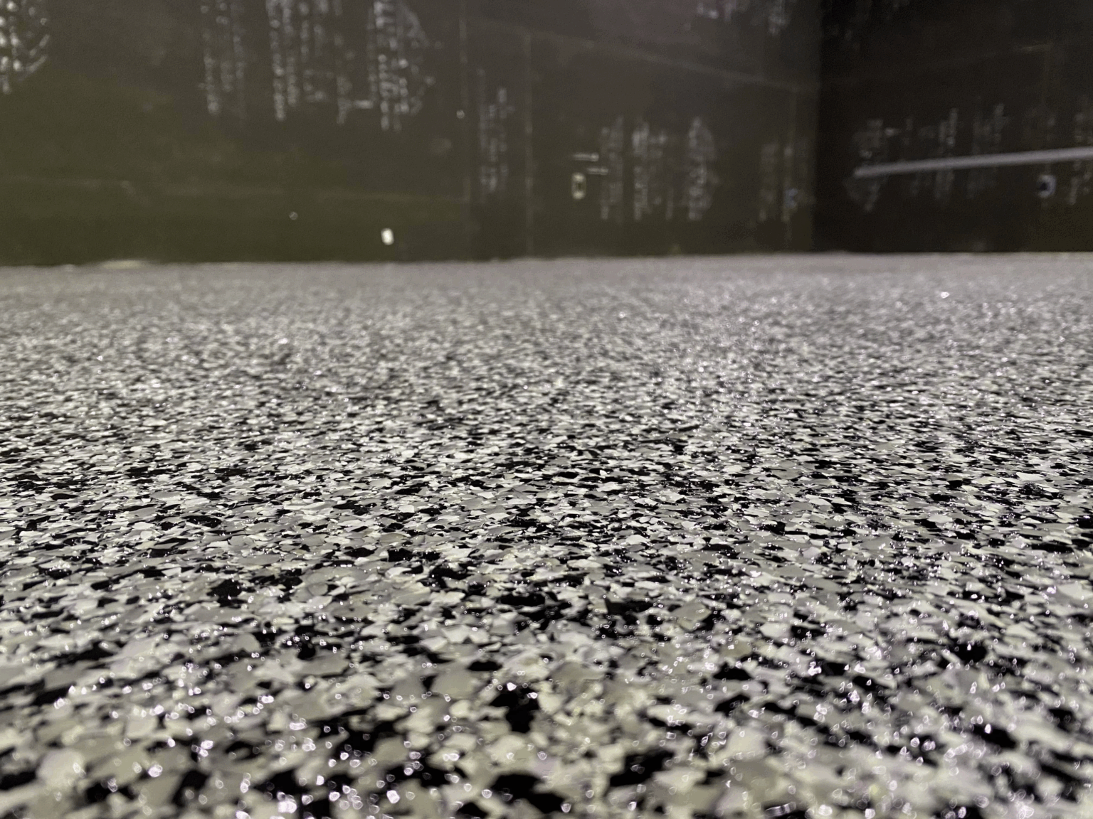 Epoxy coating with premium colored chips broadcast into the base coat for texture, visual appeal, and slip resistance.